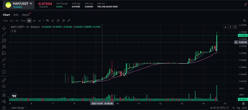 Thị trường DeFi tiếp tục sôi động khi MAP/USDT giữ vững phong độ tăng trưởng, hiện giao dịch quanh mốc 0.083 USDT, tăng gần 6.1% trong 24 giờ. Đà tăng bền vững này cho thấy dòng tiền lớn đang quay trở lại với hệ sinh thái MapNode.